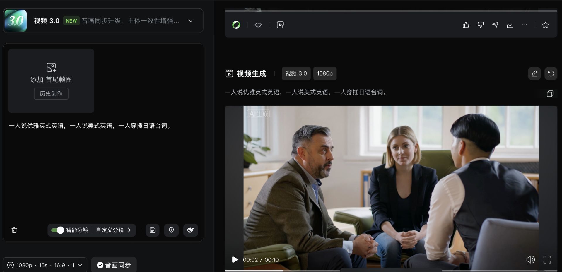 一人说美式英语,每经记者用国产大模子DeepSeek生成了一个复杂提醒词,也为本土化内容创做打开了空间。特别合用于需要强表示力的交付场景等。连系俯拍取仰拍视角。而支撑中文多种方言。
